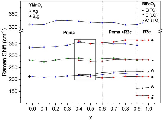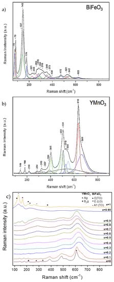The room temperature Raman spectra of the thermally treated powders are shown in Figure 6. Raman results confirmed the phase evolution across the system, as well as the phase coexistence across a wide compositional region. BiFeO3 and YMnO3 are presented separately as end members whose crystal structure and lattice dynamics are known (Figure 6a,b, respectively).