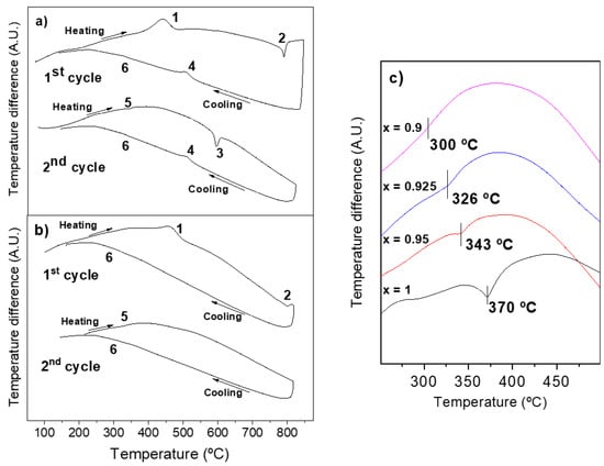 Figure 8a,b show the first and second heating-cooling cycles for compositions of x = 0.95 and 0.925, respectively. Equivalent thermal responses were found for x = 1 (to x = 0.95) and x = 0.9 (to x = 0.925). The first cycle of all compositions shows an initial exothermic effect (labelled as 1 in the figure). This thermal event is irreversible (not observed in the second cycle), and takes place at temperatures ranging from 410 °C to 460 °C. It is a common effect of nanocrystalline perovskite oxides obtained by mechanosynthesis, which has been attributed to the crystallization of the powder [21]. A second effect, this time endothermic and also irreversible, is observed at high temperatures in the range 790–800 °C (labelled as 2). Its origin is not clear, but it seems to be associated somehow with the ferroelectric transition, as it will be explained later. On subsequent cooling, two successive exothermic effects (labelled as 4 and 6) are observed for compositions, x = 1 (at 805 °C and 363 °C) and x = 0.95 (504 °C and 335 °C), while a weak single effect is detected for x = 0.925 (318 °C) and x = 0.9 (295 °C). Note that the effect labelled as 6 can hardly be discerned in Figure 8 due to the scale used. Nonetheless, their presence and temperature values were unambiguously determined with the first derivative of the cooling curve. During the following second cycle on heating, two new endothermic peaks labelled as 5 and 3 are observed for x = 1 (at 370 °C and 834 °C) and x = 0.95 (at 343 °C and 594 °C), while only effect 5 is detected for x = 0.925 (326 °C) and x = 0.9 (300 °C). All events observed in the first cycle are then reproduced during final cooling.