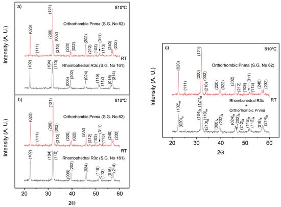 In order to confirm the association of events 3 and 4 with the ferroelectric phase transition, temperature-dependent X-ray diffraction experiments were carried out. XRD patterns at room temperature and 810 °C are presented in Figure 9a for x = 0.95. A clear structural change from rhombohedral R3c h (S.G. No. 161) to orthorhombic Pnma (S.G. No. 62) was found, as expected to occur across the ferroelectric transition [9]. Moreover, measurements were also carried out for x = 0.925 (Figure 9b) and 0.9 (Figure 9c). An analogous evolution to that described for x = 0.95 was found for the former case, which indicates the occurrence of the phase transition, even if thermal effects were not observed. For x = 0.9, the room temperature X-ray diffraction pattern corresponds to the coexistence of two structural phases as stated in Section 3.1, while a single orthorhombic phase is found at high temperatures.
