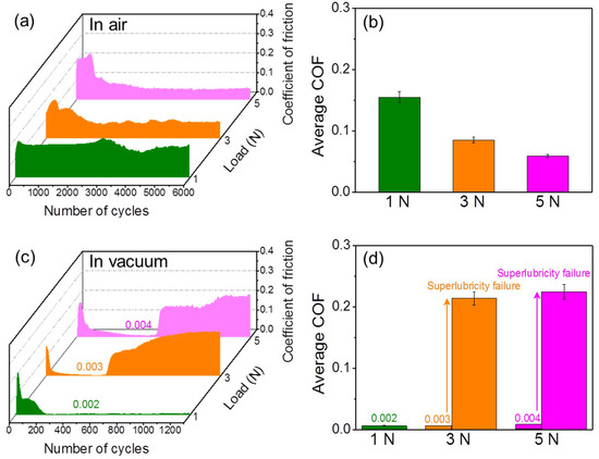 - The load dependence of friction behaviors on H-DLC film strongly depends on the surrounding environment. The running-in stage only occurs at high normal load conditions following a relatively low-friction coefficient in humid air. By contrast, the friction can decrease to a superlubricity state at low load conditions but can easily fail at high loads in vacuum.