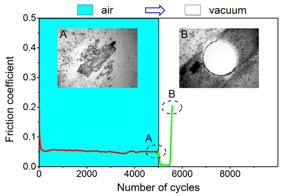 - The lifetime of the low-friction state after the running-in process is determined by the formation and stability of the transfer layer on the counterface under both humid air and vacuum conditions. The friction coefficient decreases to a relatively low level at a high enough load in humid air. Conversely, the superlubricity realized in vacuum can only be maintained for a long time at a low load.