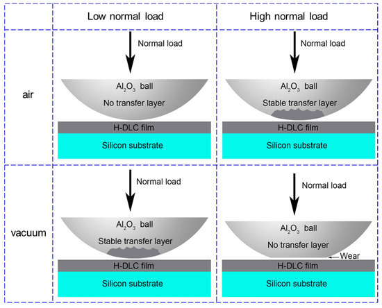 - The contribution of H-DLC substrate surface graphitization to a sharp drop in friction was ruled out in all cases. In humid air, the transfer layer on the counterface formed at relatively high loads plays a key role in the sharp drop of the friction coefficient. In vacuum, the transfer layer can be formed at low load conditions, resulting in a superlow friction coefficient. However, the formed transfer layer cannot be maintained for a long time at relatively high loads.