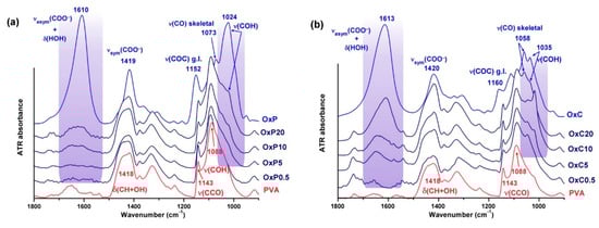 The fingerprint region of attenuated total reflection (ATR)-FTIR spectra of the poly(vinyl alcohol) (PVA) hydrogels, in comparison with the neat PVA and OxP/OxC: (a) OxP-PVA; (b) OxC-PVA.