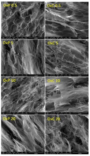 SEM microphotographs (2000× magnification) of cross-sections of PVA hydrogels containing 0.5%, 5%, 10% and 20% oxidized pullulan (OxP 0.5, OxP 5, OxP 10, OxP 20) and tricarboxy cellulose (OxC 0.5, OxC 5, OxC 10, OxC 20), respectively.