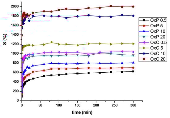 Even though from the SEM observations we could not find any significant differences in pore size in the case of the oxidized pullulan vs. tricarboxylated cellulose hydrogels, the swelling behavior measurements have revealed a remarkable feature, namely, the hydrogels made from PVA/OxC possess much higher swelling values than those made from PVA/OxP. Moreover, the swelling values increased, as the amount of OxC in the hydrogel increased. The higher swelling ability of the PVA/OxC hydrogels can be explained by the presence of a much higher number of hydrophilic carboxyl in these hydrogels as compared with PVA/OxP hydrogels. Another observation from SEM microphotographs can be made, namely: The pore size of the hydrogels varies with the amount of oxidized polysaccharides added during synthesis [,]. Larger size pores favor the swelling degree of the hydrogels, and as a consequence a higher load of drug, but at the same time, will contribute to a faster drug release [].
