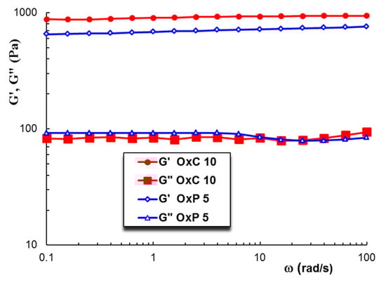 In frequency sweep tests, the elastic (G’) and viscous (G”) moduli were measured and these parameters give information about the reversibly stored deformation energy and the irreversibly dissipated energy during one cycle, respectively. For all investigated hydrogels, the G’ values were higher than the G” ones and they are nearly independent on ω, suggesting that the network is formed. Figure 5 shows the evolution of the viscoelastic moduli, G’ and G”, as a function of the oscillation frequency, ω, for two selected samples, OxC 10 and OxP 5, for which the highest values of viscoelastic parameters were obtained (Figure 6).
