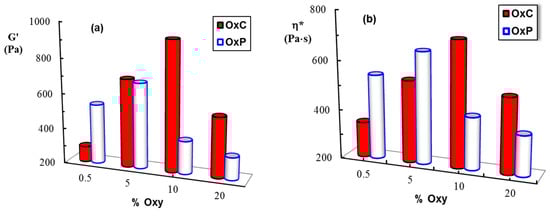 (a) Elastic modulus (G’) and (b) complex viscosity (η*) for the investigated samples with different content of oxidized polysaccharides (% Oxy) at 25 °C (ω = 1 rad/s, γ = 1%).