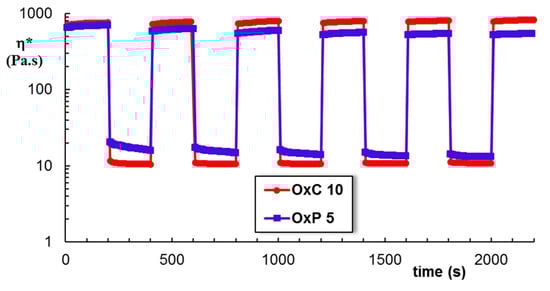 Self-healing behavior of OxC 10 and OxP 5 hydrogels when successive strains of 1% and 400% were applied (ω = 1 rad/s, 25 °C).