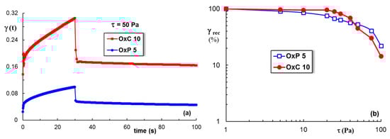 The behavior of OxC 10 and OxP 5 samples in creep and recovery tests: (a) A shear stress of 50 Pa was applied during the creep test; (b) the total elastic recovery (γrec, %) as a function of the applied shear stress during creep test for OxC 10 and OxP 5 hydrogels.