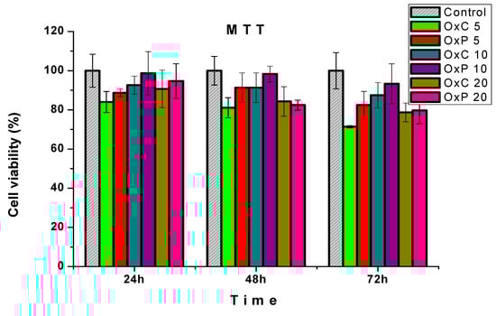 The hydrogels prepared from PVA and carboxylated polysaccharides were in vitro cytotoxicity tested, according to the ISO 10993-5:2009 standard recommendations []. The results, depicted in Figure 9, reveal that all investigated samples are non-cytotoxic. As a general observation, the PVA/OxP hydrogels keep the cells metabolic activity in time. The best cytocompatibility has been found for the sample with OxP 10. In this case, after 72 h of exposure with cells, the OxP 10 sample kept cell viability over 90%. This metabolic activity of the cells culture express their ability to adapt to in the vitro conditions. The MTT results recommend these hydrogels for biomedical applications, since they do not release any cytotoxic compounds.