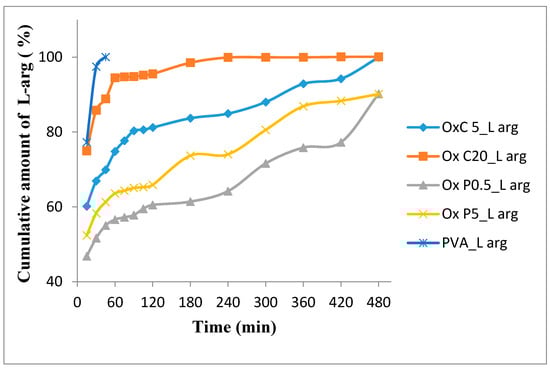 Figure 10 shows the release profile of L-arginine from hydrogels based on natural polymers with the modified structure and PVA at the physiological pH for normal tissue (7.4). It can be seen that the L-arginine release rate is higher for hydrogels with large pore sizes (OxC20_L-arg), as compared with those with the reduced pore size (OxP0.5_L-arg).