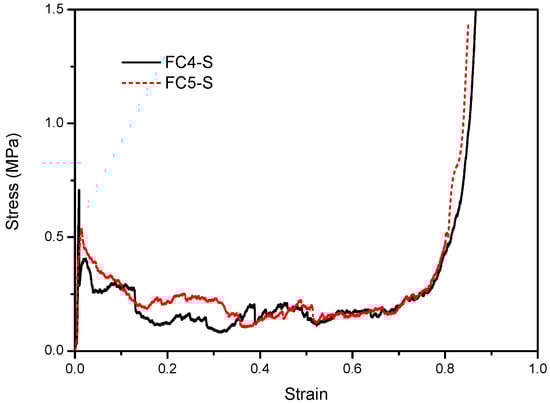 Figure 3. Stress–stain relationships of foam concrete subjected to quasi-static compression.