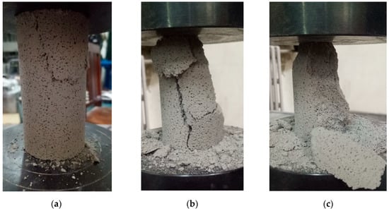 Figure 4. Test result of foam concrete subjected to quasi-static compression: (a) initial shear crack (ε = 0.008); (b) through-thickness crack (ε = 0.20); (c) detachment of large parts (ε = 0.25).