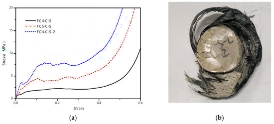 Figure 5. The CFRP-confined foam concrete subjected to quasi-static compression: (a) stress-strain relationship; (b) failure mode.