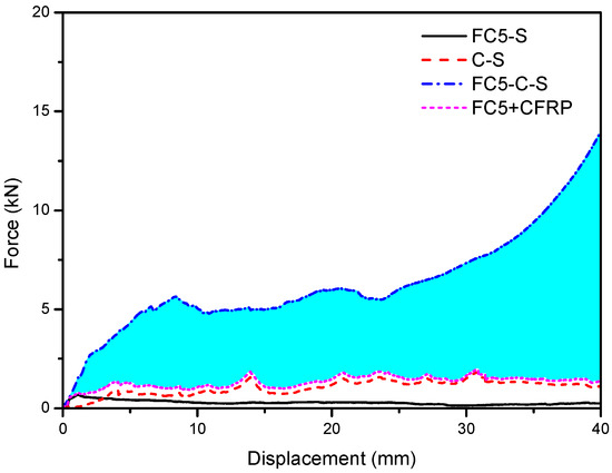 The standalone CFRP wrap, without any filling, was compressed quasi-statically, whose load-bearing capacity is indicated by the red dashed line in Figure 6. More importantly, this figure shows the reinforcement effect of the CFRP on foam concrete in terms of the plateau stress and energy absorption. It is evident that the crushing resistance of CFRP-reinforced foam concrete was several times higher than the total load taken from the foam concrete and CFRP wrap compressed separately. Subsequently, the energy absorption capacity significantly improved with the same crushing deformation. The blue area in the figure denotes the extra energy absorption due to the CFRP confinement. However, the densification strain of the specimen with CFRP was reduced compared to that without CFRP.