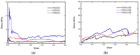 The foam concrete cylinders were compressed, and the quasi-static stress–strain relationships are shown in Figure 3. It is noteworthy that, unlike the curves of metal foam without initial overshoot peak stress, foam concrete exhibited an obvious peak stress prior to the long stress plateau, implying sudden brittle failure. The observations agree well with similar compression tests of foam concrete with different base materials [27], in which metal tailing concrete was used to manufacture the foam concrete and a relatively small strain of around 8% was crushed. Upon being subjected to further increased crushing beyond the densification strain, the walls of the foam concrete cells gradually came into contact with each other, resulting in a sharply increased compression resistance (stress).