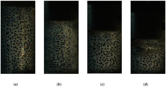 Figure 10. Response and failure mode of 400-kg/m3 foam concrete with CFRP subjected to 5-m/s compression. (a) ε = 0.10, (b) ε = 0.25, (c) ε = 0.35, and (d) ε = 0.45.