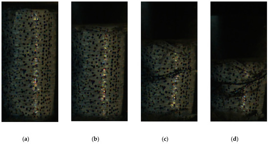 The typical response and failure mode of foam concrete is shown in Figure 4. While some parts near the loading platen were sheared off initially, major vertical cracks formed and developed with the increasing loading, followed by large parts detaching in the advanced stage.