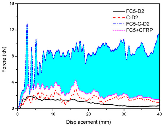 Subjected to dynamic load, the interaction between the foam concrete specimen and CFRP is indicated in Figure 12. Compared to Figure 6 for quasi-static loading, the strengthening effect was similar in the sense that the crushing resistance of CFRP-reinforced foam concrete, combining the foam concrete and CFRP with stronger interaction, was significantly higher than that of the standalone foam concrete and CFRP wrap simply added together. The difference from that subjected to quasi-static compression was that all stresses become higher, including the resistance of crushing foam concrete and CFRP wrap alone and the CFRP reinforced specimen. It can be observed that there are oscillations in almost all of the load–displacement curves in the figure, which is due to the lateral vibration of the crosshead during vertical compression induced by the eccentricity of the CFRP-confined specimen.