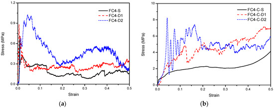 Figure 8. The stress–strain relationship subjected to 1-m/s compression: (a) foam concrete without CFRP, and (b) foam concrete with CFRP.