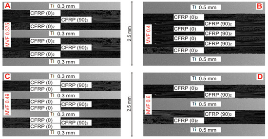 The metal volume fraction is defined as the ratio of the sum of the thicknesses of the individual titanium layers and the total thickness of the laminate, see Equation (1) [26].