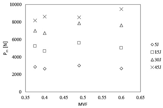 The detailed maximum force values depending on the MVF coefficient of the HTCL laminate in the ranges of impact energy of 5 to 45 J are found in Figure 3.