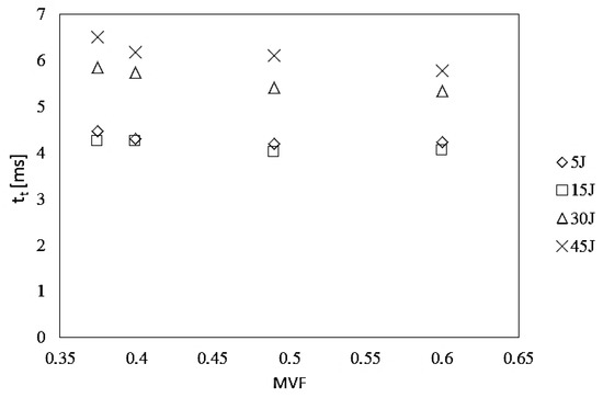 The experimentally recorded values of the total indenter contact time with the laminate (tt) were analyzed in detail. The recorded tt values in juxtaposition to the MVF coefficients for various impact energies are shown in Figure 4.