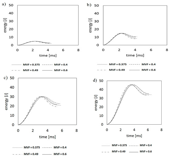 The curves represented the energy absorption process in time of HTCL with various MVF after low-velocity impact with energy 5 J (a); 15 J (b); 30 J (c); and 45 J (d).