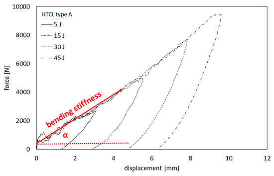 An example of force–displacement curves after impact with a visualization of bending stiffness.