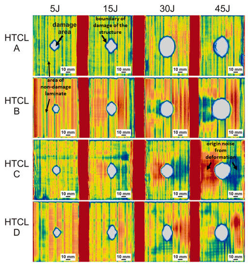 The C-scan maps of laminates and their damage after impact are presented in Figure 8.