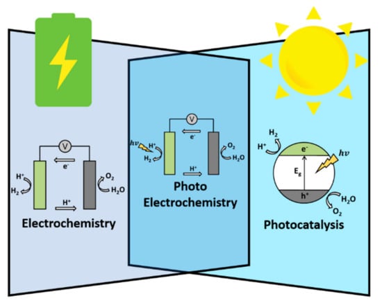 Increasing energy consumption rates and dependency on fossil fuels have resulted in wide-spread ecological contamination. The dependency on fossil fuels can be reduced by encouraging the use of hydrogen as an energy resource. Hydrogen has the potential to be an ideal energy carrier because it theoretically possesses high gravimetric energy density, can be produced easily through various methods, and, most significantly, produces zero CO2 emission rates. Hence, the use of hydrogen as an energy source has the potential to significantly lower current global pollution rates. In addition, water splitting systems that involve splitting of water into hydrogen and oxygen molecules can be considered as sustainable and reliable because they can produce high-purity hydrogen and oxygen without any destructive by-products. Moreover, these sustainable water-splitting systems can be powered by existing renewable energy sources such as solar, wind, hydro, and geothermal powers. Since electrochemical water splitting was first reported, it has been widely applied. Water electrolysis, an efficient and clean technology used for the generation of high-purity hydrogen, also shows excellent adaptability. Solar-powered water splitting systems are developed through the engagement of photocatalytic and photoelectrochemical systems that effectively convert incident solar energy into chemical bonds by using light-absorbing materials [1,2,3,4].