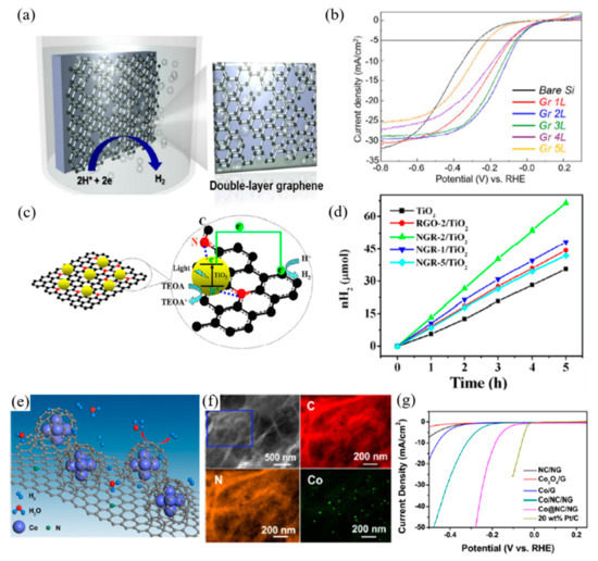 Graphene applied in photoelectrochemical cells (a,b), as photocatalysts (c,d), and electrochemical cells. (e–g) for water splitting reactions. (a) Schematic of double-layer graphene on p-silicon photocathode, (b) Photocurrent density–potential (J–E) curves of multiple layers of graphene on lightly boron-doped planar p-Si [39], (c) Schematic illustration for the strong coupling between TiO2 and N atoms in N-doped graphene sheets (NGR), enhanced photoinduced charge transfer, and photocatalytic hydrogen generation, (d) The time course of hydrogen production from a 50 mL aqueous solution containing 10 vol% TEOA aqueous solution with different photocatalysts [42], (e) Schematic representation of the HER process at the surface Co/NGR, (f) EDS elemental maps of C, N, and Co for Co/NGR, (g) Polarization curves for HER in 0.5M H2SO4 at a glassy carbon electrode modified with indicated catalysts [44].