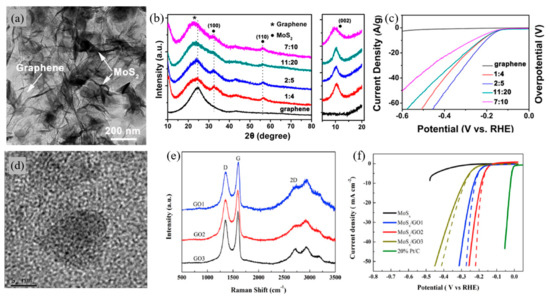 Graphene oxide (GO) applied in electrochemical cells for water splitting reactions. (a) Representative TEM image of the MoS2/Graphene, (b) XRD patterns of the MoS2/graphene hierarchical frameworks at different MoS2 loadings and zoom-in of the low-angle region of the XRD profiles, (c) Polarization curves of MoS2/graphene 3D framework at different MoS2 loadings. The currents were normalized to the total mass of the catalysts [46]. (d) HR-TEM image of the MoSx/GO nanocomposite, (e) Raman spectra of different GO, (f) Linear sweep voltammogram (LSV) curves in 0.5M H2SO4 for different MoSx/GO electrocatalysts [47].