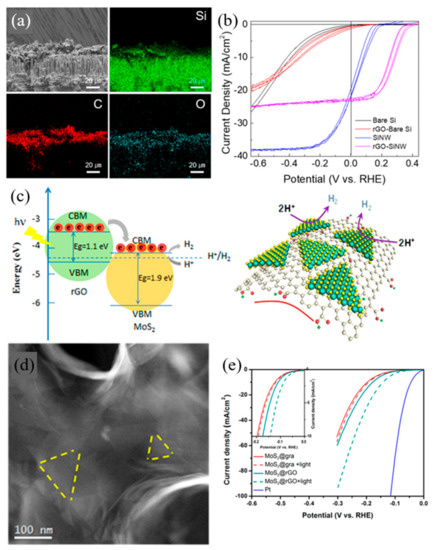 Reduced graphene oxide (rGO) applied in photoelectrochemical cells (a,b), as photocatalysts (c), and electrochemical cells (d,e) for water splitting reactions. (a) Cross-Sectional SEM image of rGO on silicon nanowire (SiNW) photoelectrode and corresponding EDS elemental mapping describing the presence of Si, C and O, (b) Photoelectrochemical responses for bare Si, SiNW, rGO-bare Si and rGO-SiNW. Different lines of the same color represent repeated measurements at the same condition [7], (c) Schematic illustration of band alignment and mechanism of photo-excited charge transfer in MoS2/rGO (left) and Schematic image of MoS2/rGO, (d) HAADF-STEM image showing the morphology of MoS2/rGO, (e) Polarization curves with/without light irradiation [49].