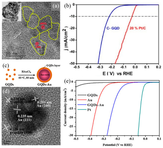 The electrocatalytic performance of nitrogen functionalized inter-connected GQDs (c-GQDs) was reported by Kundu et al. [73] GQDs were treated with hydrazine hydrate in acidic conditions so as to synthesize 3D c-GQDs. 0D GQDs are inter-connected through a form of hydrazine bonding, as shown in Figure 6a. The c-GQDs exhibited a smaller overpotential of 220 mV with 20% Pt/C was benchmarked at 50 mV, as shown in Figure 6b. The c-GQDs also exhibited excellent durability even after 1000 cycles. The results of synthesizing c-GQDs shows that it is a promising candidate for hydrogen production and opens new prospects for carbon-based catalysts. Lou et al. [74] reported on graphene quantum dots/gold (Au) hybrid nanoparticles as an electrocatalyst for HER, as shown in Figure 6c,d. Au nanoparticles are known for their high catalytic activity supporting metal oxide catalysts, as well as carbon-based catalysts, including GQDs. The hybrid nanoparticles showed enhanced electrochemical performance towards HER, compared to pure GQDs and pure Au nanoparticles. The Tafel value of both GQDs/Au and pure Au nanoparticle is approximately equal at 75–78 mV·dec−1. However, as shown in Figure 6e, the overpotential of 0.14 V was achieved with GQDs/Au hybrid nanoparticles for HER, whereas pure Au nanoparticles exhibit a higher overpotential of 0.27 V, indicating that hybrid nanoparticles exhibit significantly higher electrocatalytic activity than pure Au.
