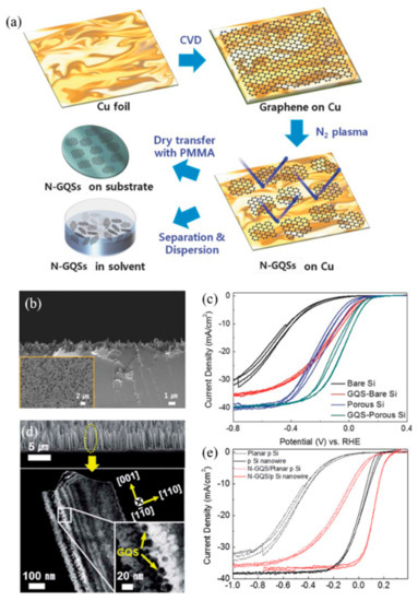 Atom-thick Graphene Quantum Sheets (GQSs) were introduced into the PEC system as a co-catalyst for the water splitting system [75]. Moon et al. [27] introduced nitrogen-doped graphene quantum sheets (N-GQSs) for solar-driven hydrogen evolution, as shown in Figure 7. N-GQSs can be synthesized through a solvent-free method, which is highly advantageous compared to the complicated wet-chemical reactions required for synthesis of GQDs. By applying nitrogen plasma to as-grown graphene on Cu, the sheet of graphene can be converted to N-GQSs. The resulting N-GQSs can be transferred as a film-like layer or easily dispersed in an organic solvent to be transferred onto a Si substrate as a PEC catalyst for HER. Sim et al. [28] applied the N-GQSs to both planar Si as well as a porous Si photoelectrode. By inducing N-GQSs, the onset potential was positively shifted by 0.29 V for planar Si, and 0.09 V for porous Si. With a potential of −5 mA·cm−2 similar values of 0.3 V and 0.11 V, planar Si and porous Si, respectively, were observed. The positive shift of the overall J–E curves induced by the N-GQSs indicates an enhancement of HER performance. The group further experimented with N-GQSs on Si nanowire (SiNW). Similarly, an enhanced HER performance can be observed with a positive shift of 0.09 V for the onset potential, in addition to a high ABPE of 2.29%, which is 2.5-fold higher than that of bare SiNW.