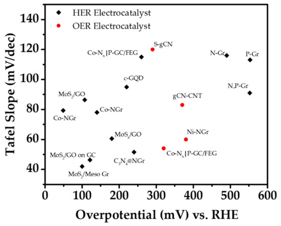 We went through the low-dimensional carbon-based materials for the water splitting reactions. The materials are summarized below for electrochemical, photocatalysis, and photoelectrochemical system. The few key parameters measured for electrochemical systems are the Tafel slope and the overpotential to investigate the performance of the materials. Figure 8 shows a simple plot for the low-dimensional carbon-based materials in EC water splitting along with the detailed information and references in Table 1. As for the photocatalysis which is shown in Table 2, the H2 production rate and the light source are the important factor. Similar with photocatalysis, the intensity of the light source is a crucial factor in photoelectrochemical system. The onset potential measured when the current density reaches −1 mA·cm−2, and the overpotential, which is measured when the current density reaches −10 mA·cm−2, are the important factors in PEC hydrogen evolution along with the light intensity. However, in some cases where the materials show relatively low current density, the photocurrent density is measured to evaluate the performances. Likewise, the current density of the oxygen evolution performances is relatively low compared to HER, therefore the photocurrent density is measured along with the light intensity. The HER performances are shown in Table 3 while Table 4 shows the OER performances of the low-dimensional carbon-based materials.