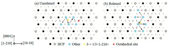 We first studied the influence of O atoms on the core structure of full screw <a> dislocation. The initial unrelaxed core structure in the basal plane is shown in Figure 2a. An oxygen atom was inserted in the octahedral Site A marked as the red square in the vicinity of the basal dislocation core. After ionic and electronic relaxation, screw <a> dislocation almost lay on the prism plane as shown in Figure 2b. This indicates that during the relaxation process, the basal screw <a> dislocation cross-slipped onto the prismatic plane. Normally, in pure Mg, the full <a> dislocation is metastable and would dissociate into two Shockley partials bounded by an I2 stacking fault ribbon on the basal plane [18,28]. In this simulation, the dissociation is inhibited under the local influence of an O atom.
