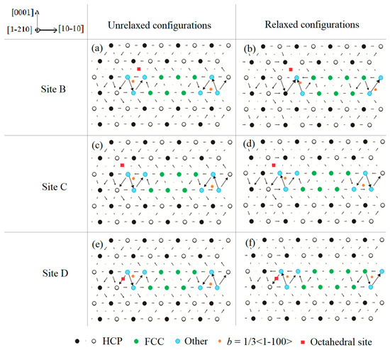 Next, the O atoms were placed in the octahedral sites in the vicinity of the extended basal dislocation core, which was obtained after relaxing the full basal <a> dislocation in pure Mg. The chosen three octahedral sites were labeled as red squares in Figure 3a,c,e. Note that Site B and C are above the glide plane of the dissociated dislocation, and Site D resides in the glide plane. After relaxation, no dramatic structural change is observed. Only when the O atom is located in Site B and D, the extended dislocation cores move a minor distance away from the O atom, which can be seen from the location change of the right partial dislocation line (orange dots) recognized by DXA method in Figure 3b,f. This phenomenon indicates that a repulsive force exists between the O atom and the basal dislocation core.