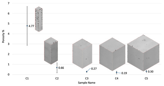 The 3D reconstructions of the cross-sectioned samples and their porosity percentages are presented in Figure 2. In the majority of the samples, defects preferentially aligned around the edges of the cross sections. This preferential alignment could be linked to the porosity emerging between the contour scan and core scan regions. This is in agreement with an earlier study by Yang et al. [49] for Al alloys.