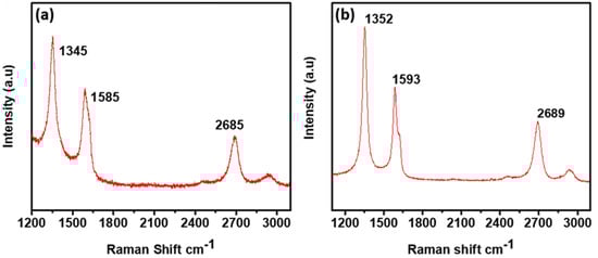 (a) Raman spectrum of as-deposited reduced graphene oxide and (b) the spectrum of the graphene oxide produced by the additional argon plasma treatment.