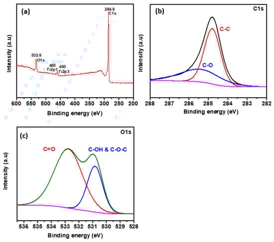 The XPS spectra survey of the as-deposited hydrophobic reduced graphene oxide (rGO). (a) XPS wide-scan spectrum and (b) XPS high-resolution spectrum registered for the energy range of C1s and (c) O1s.
