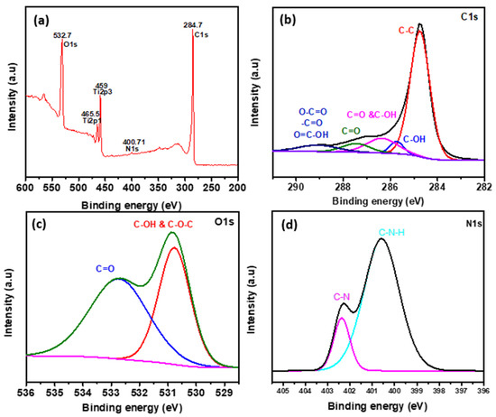 The XPS spectra survey of the hydrophilic graphene oxide (GO). (a) XPS wide-scan spectrum, (b) XPS high-resolution spectrum registered for the energy range of C1s, (c) O1s, and (d) N1s spectra of GO.