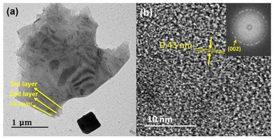 This argon plasma treatment resulting in the formation of oxygen-containing functional groups makes the carbon deposited material more hydrophilic by adding oxygen functional groups onto the surface of GO deposited on the silicon (Si) electrode. The reason behind the transition from hydrophobic to hydrophilic is that energy from argon plasma is transferred to the deposited rGO by radiation (a distance of 1 cm was maintained between the plasma flame and substrate). As a result of the energy transfer, sp2 carbon atoms broke, allowing oxygen atoms from the environment to react on the surface of carbon atoms making it hydrophilic. A minute amount of nitrogen atoms were also added from the environment as our process was operated in an open environment. The transition of the rGO surfaces from hydrophobic to hydrophilic using this easy and straightforward argon plasma treatment was conducted in a cost-optimized method without applying any temperature and vacuum formation. The mechanism that made the surface hydrophilic is the ion energy in plasma, which is usually higher than 10 eV exceeding the binding energy for carbon: 2.7 eV and 3.6 eV for π-bonding and σ-bonding, respectively, forming oxygen-containing functional groups []. Functional groups like C–OH, C–H, C–O–C, –COOH, C–O–C, C–OH, –C=O, C=O, and carboxylates (O–C=O) make hydrophilic GO surfaces due to dynamic interaction with water by generating intermolecular forces called hydrogen bonding [,,,]. Figure 4 shows TEM images of obtained rGO in order to investigate its morphology, and the images were examined through FE-TEM to confirm that rGO was formed well. In Figure 4a, the representing FE-TEM images showing that transparent multi-layers are stacked one above the other with no crumples and ripples are because the layers are smoothly deposited by plasma []. The appearance of these crumples usually appears in the exfoliation and restacking processes that create the deformation of the stacked layers []. Figure 4b shows that rGO contains multi-layers and the inset is the selected area diffraction showing polycrystalline structure, corresponding to the (002) rGO plane.
