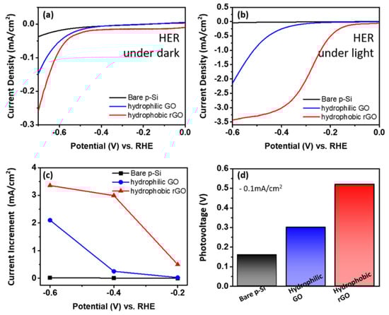 Comparison of the electrochemical activity of hydrophilic GO and hydrophobic rGO deposited on silicon (Si) electrodes. (a,b) Photocurrent density—potential curves of bare p-Si, hydrophilic GO, and hydrophobic rGO under dark and light conditions and the potential swept from 0 V to –0.6 V vs. RHE in a three-electrode cell. (c) Current increment between dark and light conditions. (d) Photovoltage of bare p-Si, hydrophilic GO, and hydrophobic rGO at −0.1 mA cm−2.