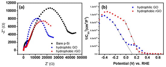 Comparison of the electrochemical activity of hydrophilic GO and hydrophobic rGO deposited on silicon (Si) electrodes. (a) Mott–Schottky plots from capacitance measurement as a function of potential vs. RHE under dark conditions. (b) Nyquist plot for bare Si, hydrophilic GO, and hydrophobic rGO on Si electrode at 0 V vs. RHE.