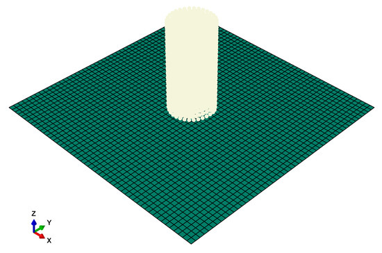 At high velocities, the bird projectile behaves like fluidic materials, and its inhomogeneity becomes negligible and hence can be treated as “soft body” [29,30]. The hydrodynamic responses of fluidic materials can be accurately modelled by the smoothed particle hydrodynamics (SPH) method, which has experienced wide use in bird-strike simulations [2,25,29,31,32,33,34]. In the present simulation study with ABAQUS software, the bird projectile was firstly meshed by finite elements (C3D8R), and then they were converted to SPH particles (PC3D) at the beginning of the bird-impact analysis (time threshold = 0). A cylinder-shaped projectile was considered, with the length-to-diameter ratio being 2 (length 200 mm and diameter 100 mm, respectively). The mass density of the bird projectile was 950 kg/m3, and the total mass was 1.49 kg. The Mie–Grüneisen equation of state (EOS) was used to model the hydrodynamic behavior of the bird projectile. This type of EOS is linear in energy and assumes a linear relationship between the shock velocity (Us) and the particle velocity (Up), which provides the linear Us − Up Hugoniot form. In the linear Hugoniot form, the relationship Us = c0 + sUp is determined by the parameters c0 (the sound velocity in the projectile) and s (material property). For gelatin projectiles [35], c0 = 1483 m/s, and material properties s = 0 and Γ0 = 0 were used in ABAQUS modelling.