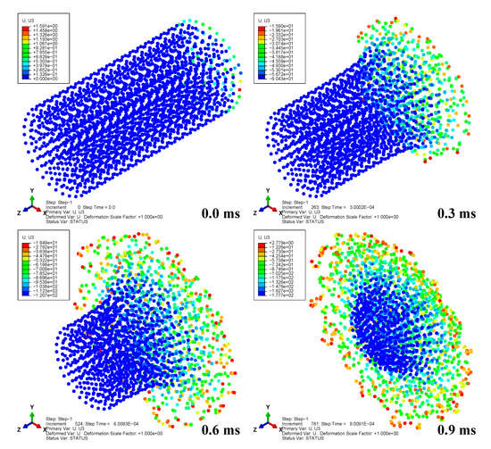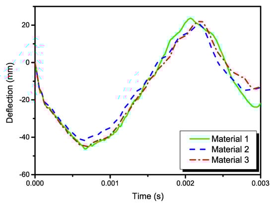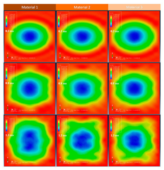 According to the numerical results, the projectile deformations of the three models are similar to each other, as shown in Figure 6, which depicts the projectile deformations (magnitudes of the particle displacement) at 1.2 ms in the models with different plate’s materials. Therefore, the different composite materials have little effect on projectile deformations. This fact can be further indicated in the time histories of the deflections, as shown in Figure 3. Before the plates go back to the neutral position, the time histories of the deflections at the plate’s centers are quite similar to each other. During this stage, the projectile contacted on the plate surface. Thus, the projectile deformations are also similar. Furthermore, in order to highlight the deformation differences among the analyzed plate models, Figure 7 compares the out-of-plane displacements for the plates at different time steps, which can provide global information of the structural impact response. Results can also verify that the global displacements were quite similar in the square laminated plates made of different material systems.