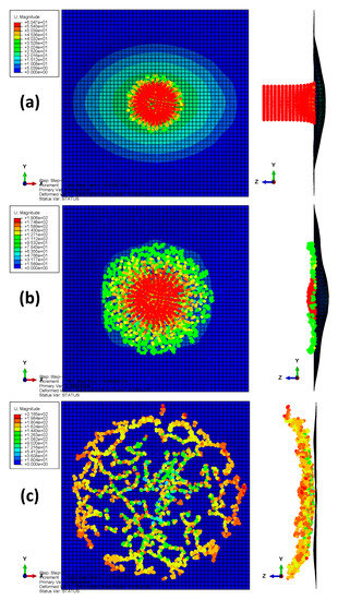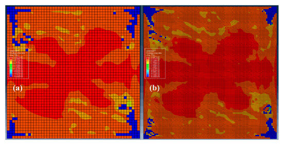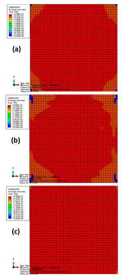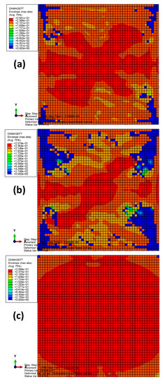 In terms of failure analysis of composite materials, it requires the mesh size to be small enough in order to well capture the fracture properties, but in the explicit dynamic analysis of structures under impact, the mesh size cannot be too small, so as to avoid the numerical instability. The reason is that the stability limit Δtstable is approximately proportional to the smallest element dimension in the mesh, which can be expressed as , where Lmin is the smallest element dimension in the mesh, and Cd is the wave speed of the material. In brief, in the non-linear simulation of structural impact, we should strike a balance between computational burden and numerical accuracy. To demonstrate present meshes applicable for the damage analysis, Figure 10 compares the fiber-tension damages of the laminate with material 1 by using different meshes. It can be validated that the relatively coarse meshes are applicable to predict the damage distributions.