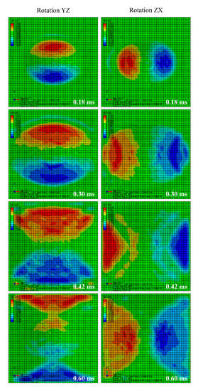 A total time period of 10 ms was simulated. Figure 2 depicts the deformation series of the bird projectile impacting the plate with material 1, with the contour denoting the displacement along z-direction. It can be seen that the deformation series agree well with the experimental results in previous literature for high-velocity soft-body impacts. The SPH particles firstly contacted the target and then spread radially over the surface. Results in Figure 2 can also indicate the rationality of the particle density of the bird projectile. Figure 3 depicts the deflection histories at the plate centers with the three different materials. From the time histories, it can be observed that the three plates experienced the maximum deflections at approximately 0.6 ms, and then the plates began to rebound. Figure 4 depicts the global magnitude of the displacements for both the bird particles and the plate with the material system 3 at three different time steps: (a) 0.3 ms; (b) 1.0 ms; (c) 1.7 ms, and both the front and side views are presented to further observe the impact deformations. The impact contact began at 0 ms. It can be seen that the projectile firstly contacted the plate, and then started to spread onto the plate surface, of which the deformation processes are similar to the previous experimental observation of soft-body impact on flat plate with other materials [7,39]. At 1.7 ms approximately, the plate began to return the neutral plane (the original undeformed plane), and the dispersed debris of the projectile began to depart the plate surface. At this point in time, the deformation of the plate was relatively small. Because of the lack of any 90° ply in the stacking sequence, the laminate was not quasi isotropic but still maintained the symmetry. In order to highlight the effect of not having any ply at 90°, the rotational deformations in yz and xz directions are studied, as shown in Figure 5. The rotational deformations extended from the center to the boundaries during the impact. It can be observed that the rotational deformations exhibit a symmetrical feature in each direction, which can be ascribed to the axial symmetry of the stacking sequence.
